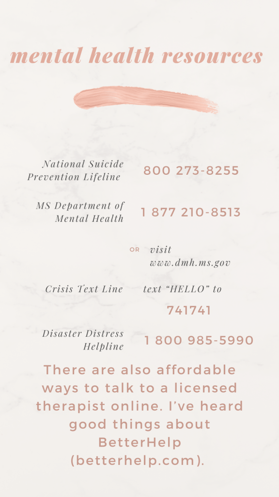 To someone experiencing a season when mental illness and intrusive thoughts reign supreme, that advice may sound like nonsense. You can’t just press a button and change how you perceive the world. I understand that. When things are that dim, my advice is just to hold on. Hang in there. Take it a minute, five seconds at a time. Nothing lasts, and it will get better. I know that’s a cliche, but it’s a cliche for a reason. It’s true. If you can, reach out to a loved one or a professional if you are hurting. I will be posting resources in a graphic below.